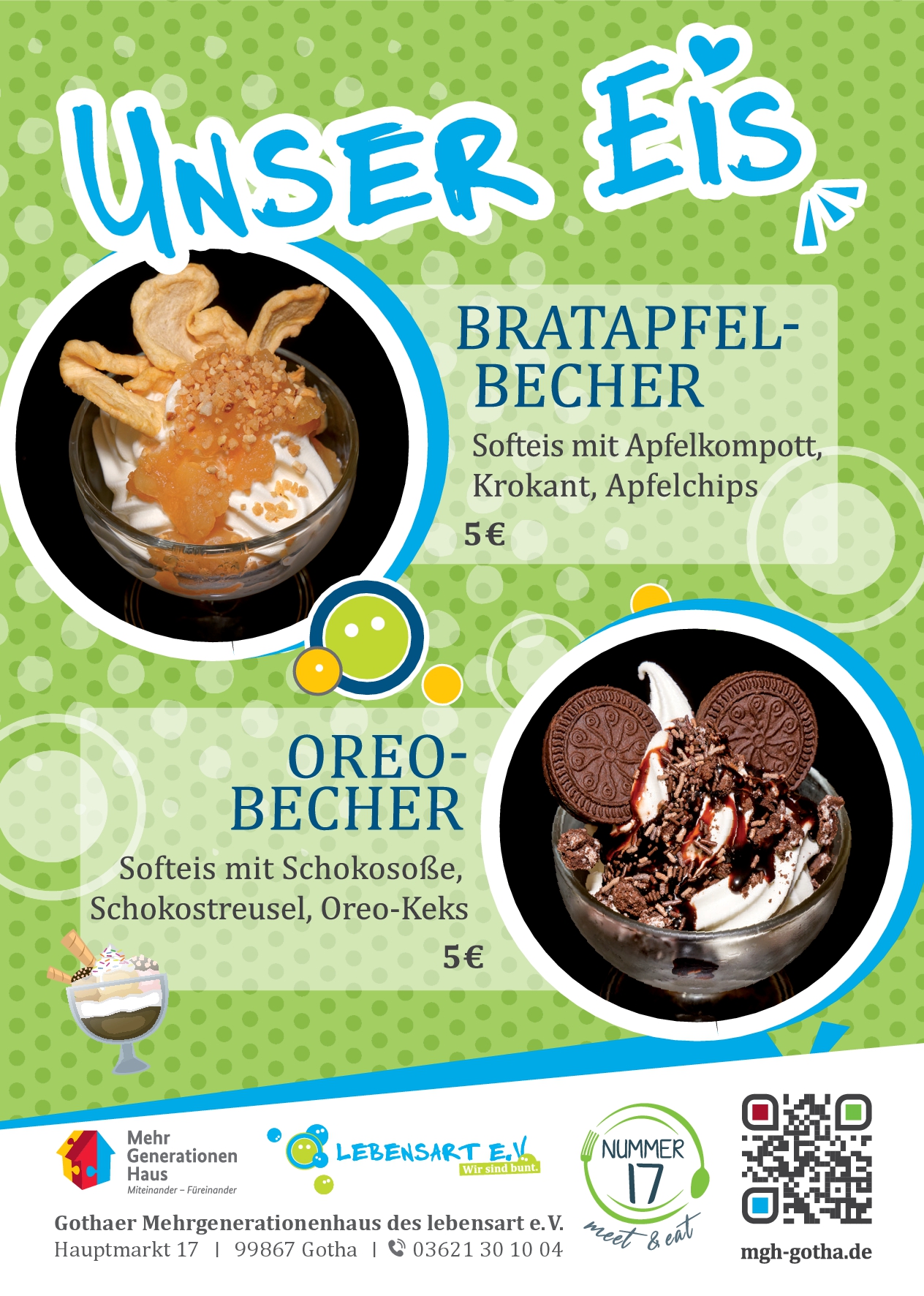 Im Lokal NUMMER 17 - meet & eat verwöhnen Euch mit Frühstück, Mittag, Kaffee und Kuchen, einschließlich Abendsnacks. Frisch gekochtes Essen, unsere geschätzten Eierkuchenvariationen, täglich eine frische Bowl, Eisbecher sowie kalte und warme Getränken sowie Platz zum Spielen, Ruhe zum Verweilen, ein kleines Schwätzchen für die Seele... Fühl Dich wohl, lass Dich nieder...